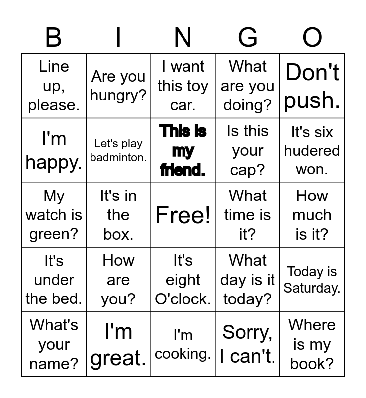 This bingo card has a free space and 24 words: How are you?, I'm great., This is my friend., What's your name?, Don't push., Line up, please., I'm happy., Are you hungry?, What time is it?, It's eight O'clock., Is this your cap?, My watch is green?, What day is it today?, Today is Saturday., Let's play badminton., Sorry, I can't., How much is it?, I want this toy car., It's six hudered won., It's in the box., Where is my book?, It's under the bed., What are you doing? and I'm cooking..