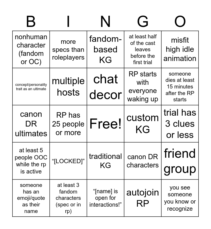 This bingo card has a free space and 24 words: “[LOCKED]”, at least 3 fandom characters (spec or in rp), chat decor, someone has an emoji/quote as their name, misfit high idle animation, nonhuman character (fandom or OC), concept/personality trait as an ultimate, more specs than roleplayers, custom KG, traditional KG, RP starts with everyone waking up, canon DR ultimates, canon DR characters, friend group, multiple hosts, autojoin RP, trial has 3 clues or less, fandom-based KG, someone dies at least 15 minutes after the RP starts, RP has 25 people or more, you see someone you know or recognize, at least 5 people OOC while the rp is active, at least half of the cast leaves before the first trial and “[name] is open for interactions!”.