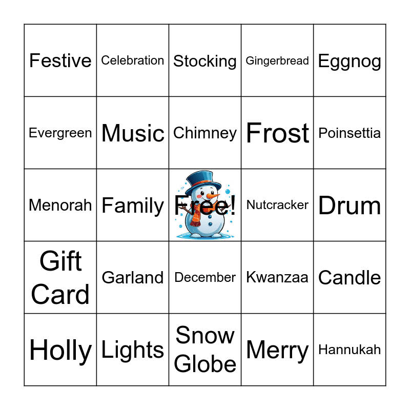 This bingo card has a free space and 65 words: Bells, Blizzard, Bow, Candle, Candy Cane, Carol, Celebration, Challah, Chimney, Cookie, December, Decorations, Drum, Eggnog, Elf, Evergreen, Family, Festive, Fireplace, Frost, Garland, Gift Card, Gingerbread, Glitter, Gold, Goodwill, Greetings, Grinch, Hannukah, Holiday, Holly, Hot Cocoa, Icicle, Joy, Kwanzaa, Lights, Magic, Menorah, Merry, Mittens, Music, North Pole, Nutcracker, Ornament, Peace, Pine Cone, Poinsettia, Presents, Reindeer, Santa, Scarf, Silver, Sleigh, Snow Globe, Snowflake, Snowmobile, Star, Stocking, Sweater, Tinsel, Toys, Tradition, Warmth, Winter and Wish.