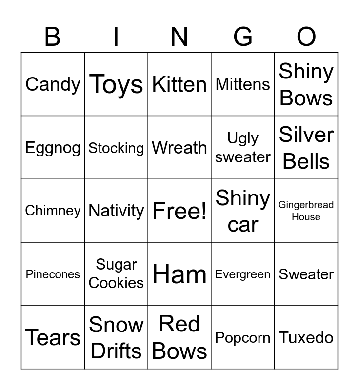 This bingo card has a free space and 74 words: Snow, Formal gown, Kitten, Mistletoe, Poinsettia, Town Square, Snowball Fight, Wedding, Tears, Garland, Carolers, Silent Night, Wreath, Eggnog, Bakery, Nativity, Preacher, Silver Bells, Santa, Chimney, Stocking, Toys, Mittens, Christmas Tree, Tuxedo, Buffet, Book, Teddy Bear, Ice Skates, Pretty Paper, Shiny Bows, Hot Chocolate, Alcohol, Santa's Hat, Icicles, Popcorn, Sisters, Penguin, Christmas Cactus, Family, Red Bows, Snow Drifts, Camera, Visitors, Candles, Candy, Fudge, Sugar Cookies, Doll, Tonka Truck, Photographs, Candy canes, Gingerbread House, Fireplace, White lights, Colored lights, Ham, Turkey, Cranberries, Sweater, Ugly sweater, Fuzzy socks, Pinecones, Deer, Shiny car, Mailman, Sleigh Bells, Bows, Evergreen, Making A List, Bells, Pajamas, Baking cookies and Merry Little Christmas.