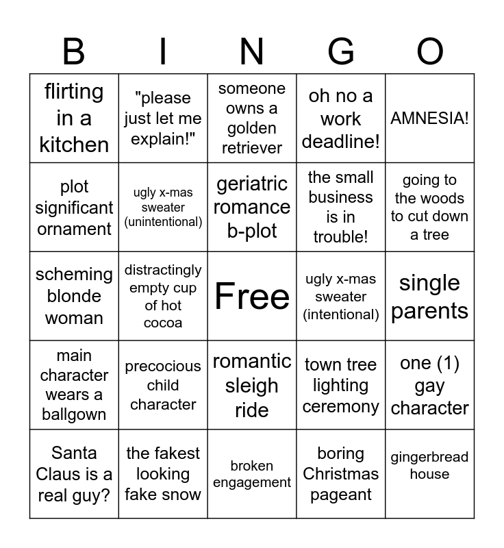 This bingo card has a free space and 24 words: precocious child character, the fakest looking fake snow, geriatric romance b-plot, Santa Claus is a real guy?, AMNESIA!, flirting in a kitchen, plot significant ornament, "please just let me explain!", ugly x-mas sweater (intentional), romantic sleigh ride, the small business is in trouble!, scheming blonde woman, town tree lighting ceremony, one (1) gay character, ugly x-mas sweater (unintentional), boring Christmas pageant, single parents, someone owns a golden retriever, going to the woods to cut down a tree, distractingly empty cup of hot cocoa, gingerbread house, main character wears a ballgown, oh no a work deadline! and broken engagement.