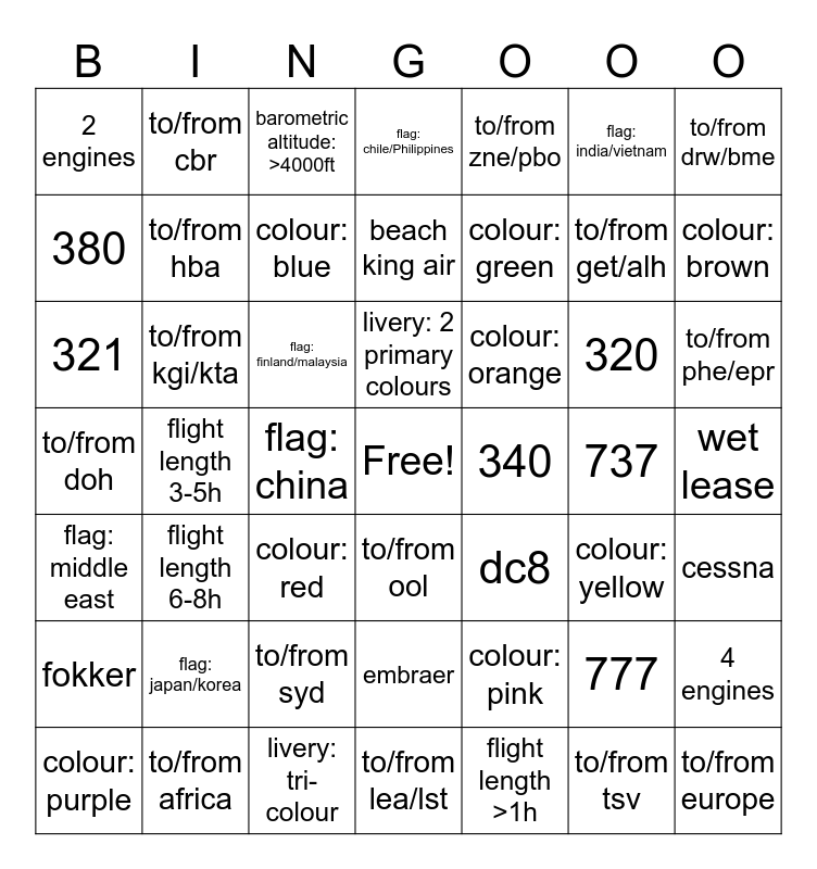 This bingo card has a free space and 88 words: livery: animal, livery: tri-colour, livery: 2 primary colours, plane without wingtips, plane with singular wingtips, plane with split-schimitar wingtips, 4 engines, 737, 777, 787, 319, 330, 320, 321, 350, 380, 340, dc8, atr, fokker, embraer, cessna, beach king air, pilatus, flag: china, flag: Singapore, flag: Indonesia, flag: england/thailand, barometric altitude: <2000ft, barometric altitude: 2000-4000ft, barometric altitude: >4000ft, flag: chile/Philippines, flag: japan/korea, flag: middle east, flag: finland/malaysia, flag: india/vietnam, 2 engines, colour: black, colour: red, colour: blue, colour: green, colour: yellow, colour: pink, colour: orange, colour: brown, colour: purple, livery: metallic, to/from syd, to/from adl, to/from hba, to/from cns, to/from ool, to/from tsv, to/from bne, to/from mel, to/from avv, to/from kgi/kta, to/from cbr, to/from dps, to/from cgk, to/from sin, to/from kul, to/from hkg, to/from sgn, to/from akl, to/from doh, to/from mnl, to/from drw/bme, to/from phe/epr, to/from get/alh, to/from europe, to/from africa, to/from lea/lst, to/from zne/pbo, from/to bkk, SF34, flight length >1h, flight length 1-3h, flight length 3-5h, flight length 6-8h, flight length 8-12h, flight length >12h, takeoff delayed <15min, takeoff delayed >15min, flight in holding pattern, altitude >30000ft, wet lease and dry lease.