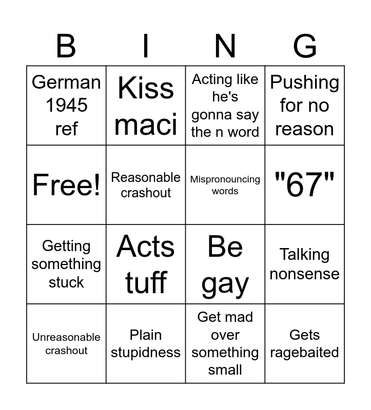 This bingo card has 16 words: Plain stupidness, Talking nonsense, Acting like he's gonna say the n word, German 1945 ref, Getting something stuck, Kiss maci, Be gay, Get mad over something small, Free!, Reasonable crashout, Unreasonable crashout, Pushing for no reason, Acts tuff, "67", Mispronouncing words and Gets ragebaited.