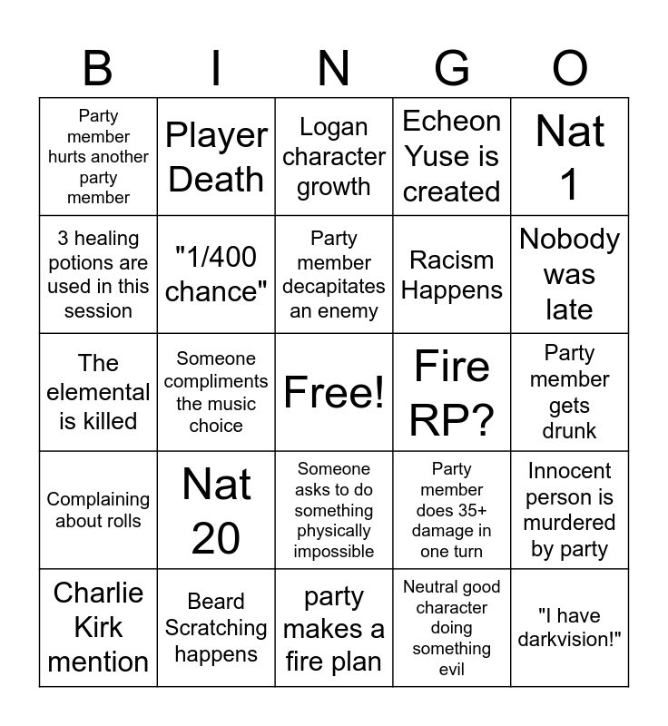 This bingo card has a free space and 24 words: Nat 20, Beard Scratching happens, Party member decapitates an enemy, Charlie Kirk mention, Nat 1, Party member hurts another party member, 3 healing potions are used in this session, Player Death, Fire RP?, Someone asks to do something physically impossible, Racism Happens, The elemental is killed, Party member does 35+ damage in one turn, Innocent person is murdered by party, "1/400 chance", Neutral good character doing something evil, Party member gets drunk, Logan character growth, Nobody was late, Someone compliments the music choice, "I have darkvision!", Complaining about rolls, Echeon Yuse is created and party makes a fire plan.
