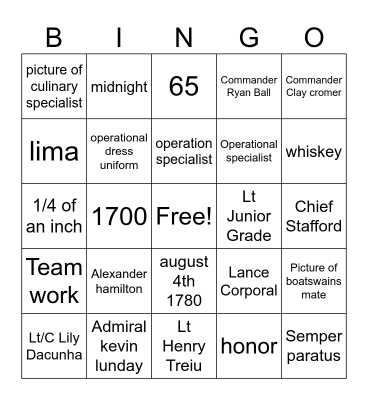 This bingo card has a free space and 43 words: Operations, Semper paratus, Senior maritime science instructor, Lt/C Lily Dacunha, P02, honor, 65, Rear admiral will watson, Commander Clay cromer, Admiral kevin lunday, Commander Ryan Ball, Lt Junior Grade, august 4th 1780, Alexander hamilton, SCPO Neff, Lt Henry Treiu, Seaman Apprentice, 1/4 of an inch, juliet, whiskey, midnight, one, Lt Claire Lafave, picture of culinary specialist, President Donald Trump, Chief Stafford, Aviation Electrical technician, Cape May NY, Sergeant, Lance Corporal, Team work, ranks, Picture of boatswains mate, Admiral, 1700, Damage control, yeoman, PO1, operation specialist, lima, Operational specialist, zero, operational dress uniform and department of homeland security.