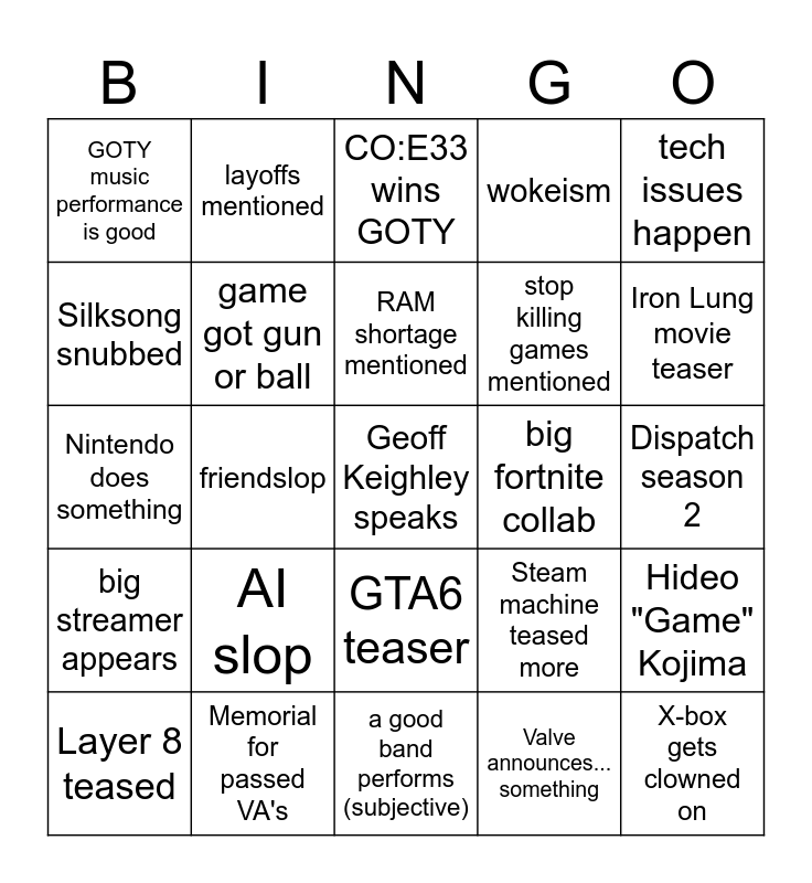 This bingo card has a free space and 24 words: AI slop, Memorial for passed VA's, RAM shortage mentioned, Layer 8 teased, tech issues happen, GOTY music performance is good, Silksong snubbed, layoffs mentioned, big fortnite collab, GTA6 teaser, stop killing games mentioned, Nintendo does something, Steam machine teased more, Hideo "Game" Kojima, game got gun or ball, Valve announces... something, Dispatch season 2, CO:E33 wins GOTY, Iron Lung movie teaser, friendslop, X-box gets clowned on, big streamer appears, wokeism and a good band performs (subjective).