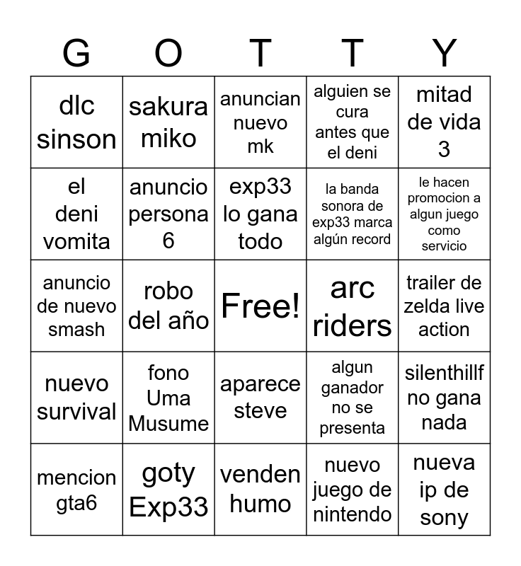 This bingo card has a free space and 24 words: fono Uma Musume, goty Exp33, exp33 lo gana todo, mencion gta6, mitad de vida 3, dlc sinson, el deni vomita, sakura miko, arc riders, aparece steve, la banda sonora de exp33 marca algún record, anuncio de nuevo smash, algun ganador no se presenta, silenthillf no gana nada, anuncio persona 6, nuevo juego de nintendo, trailer de zelda live action, anuncian nuevo mk, le hacen promocion a algun juego como servicio, robo del año, nueva ip de sony, nuevo survival, alguien se cura antes que el deni and venden humo.