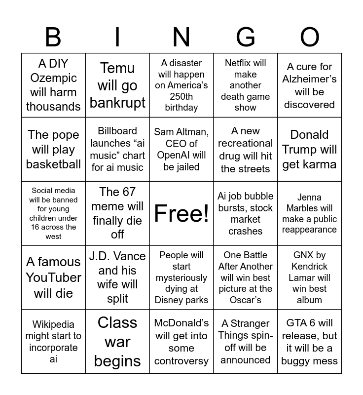 This bingo card has a free space and 24 words: J.D. Vance and his wife will split, Class war begins, Sam Altman, CEO of OpenAI will be jailed, Wikipedia might start to incorporate ai, A cure for Alzheimer’s will be discovered, A DIY Ozempic will harm thousands, The pope will play basketball, Temu will go bankrupt, Ai job bubble bursts, stock market crashes, People will start mysteriously dying at Disney parks, A new recreational drug will hit the streets, Social media will be banned for young children under 16 across the west, One Battle After Another will win best picture at the Oscar’s, GNX by Kendrick Lamar will win best album, Billboard launches “ai music” chart for ai music, A Stranger Things spin-off will be announced, Jenna Marbles will make a public reappearance, A disaster will happen on America’s 250th birthday, Donald Trump will get karma, The 67 meme will finally die off, GTA 6 will release, but it will be a buggy mess, A famous YouTuber will die, Netflix will make another death game show and McDonald’s will get into some controversy.