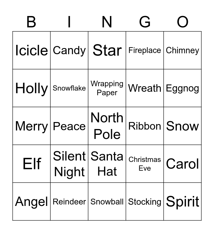This bingo card has 60 words: Santa, Reindeer, Sleigh, Elf, Stocking, Candy Cane, Snowflake, Ornament, Wreath, Gingerbread, Fireplace, Mistletoe, Holly, Bells, Snowman, Icicle, North Pole, Chimney, Presents, Wrapping Paper, Ribbon, Star, Angel, Carol, Nativity, Tree, Lights, Tinsel, Eggnog, Cookies, Hot Chocolate, Frosty, Rudolph, Sleigh Bells, Candy, Garland, Noel, Peace, Joy, Merry, Ho Ho Ho, Silent Night, Snow, Winter, Christmas Eve, Christmas Day, Advent, Gift, Chimney, Santa Hat, Snowball, Pinecone, Scarf, Mittens, Blizzard, Holiday, Festive, Season, Spirit and Cheer.