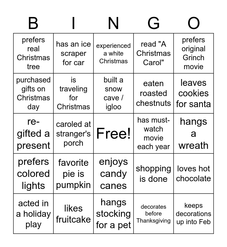 This bingo card has a free space and 31 words: hangs stocking for a pet, sent Christmas cards out this year, caroled at stranger's porch, likes egg nog, prefers real Christmas tree, experienced a white Christmas, is traveling for Christmas, shopping is done, has must-watch movie each year, decorates before Thanksgiving, hangs a wreath, keeps decorations up into Feb, gone out just to see lights, shoveled snow, leaves cookies for santa, has built a snowman, loves hot chocolate, favorite pie is pumpkin, prefers colored lights, enjoys candy canes, prefers original Grinch movie, is wearing festive socks now, acted in a holiday play, has an ice scraper for car, eaten roasted chestnuts, purchased gifts on Christmas day, read "A Christmas Carol", re-gifted a present, likes fruitcake, built a snow cave / igloo and gone sledding / skiing this year.