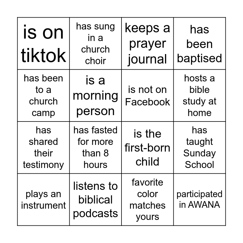 This bingo card has 35 words: is left-handed, born in the same month as you, has read the entire bible, is not on Facebook, does a morning devotional, has been baptised, is a morning person, is a night owl, hosts a bible study at home, loves to sing, is the first-born child, has been to a church camp, is taller than you, is shorter than you, is on tiktok, listens to biblical podcasts, is the baby of the family, has taught Sunday School, participated in AWANA, plays an instrument, doesn't drink caffeine, is a coffee lover, can speak more than one language, grew up in church, keeps a prayer journal, has fasted for more than 8 hours, has been in a church skit/play, has been a part of a prayer chain, has shared their testimony, favorite color matches yours, participated in VBS, owns more than two bibles, has been on a mission trip, has sung in a church choir and is a great cook.