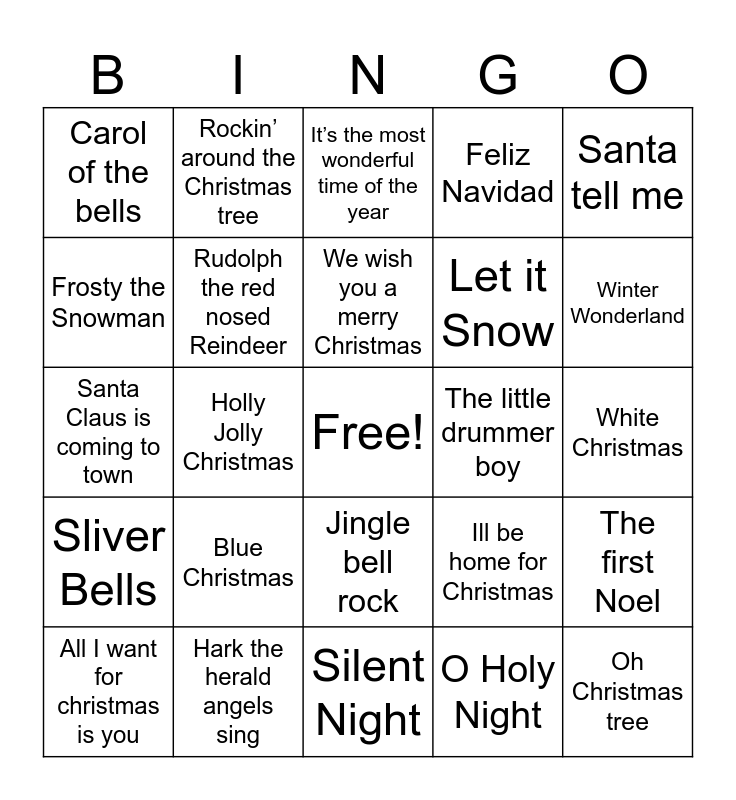 This bingo card has a free space and 32 words: All I want for christmas is you, Jingle Bells, Silent Night, Deck the halls, White Christmas, Frosty the Snowman, Rudolph the red nosed Reindeer, Twelve days of christmas, Let it Snow, It’s beginning to look a lot like Christmas, Santa Claus is coming to town, Rockin’ around the Christmas tree, Have yourself a merry little Christmas, O Holy Night, Winter Wonderland, Joy to the world, Hark the herald angels sing, We wish you a merry Christmas, The little drummer boy, The first Noel, Sliver Bells, O come all ye faithful, Jingle bell rock, Ill be home for Christmas, Santa tell me, Carol of the bells, Holly Jolly Christmas, It’s the most wonderful time of the year, Feliz Navidad, Oh Christmas tree, Run Rudolph Run and Blue Christmas.