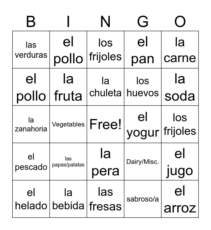 This bingo card has a free space and 59 words: el agua, la bebida, el cereal, el pescado, sabroso/a, las arvejas, la fruta, la hamburgesa, los huevos, la leche, el pan, el atún, el pollo, el queso, el sandwich, las verduras, el arroz, la carne, la comida, la chuleta, el yogur, los frijoles, el helado, el jugo, el maiz, el pavo, la pizza, el puerco, la soda, el bistec, la chuleta de cerdo, el jamón, el pavo, el pescado, el pollo, la salchicha, el atún, Vegetables, la lechuga, la zanahoria, el tomate, las papas/patatas, los frijoles, el maíz, el aguacate, Fruits, la naranja, las uvas, la pera, las fresas, el limón, Grains/Sides, el pan, el cereal, las papas fritas, Dairy/Misc., el huevo, la leche and el yogur.