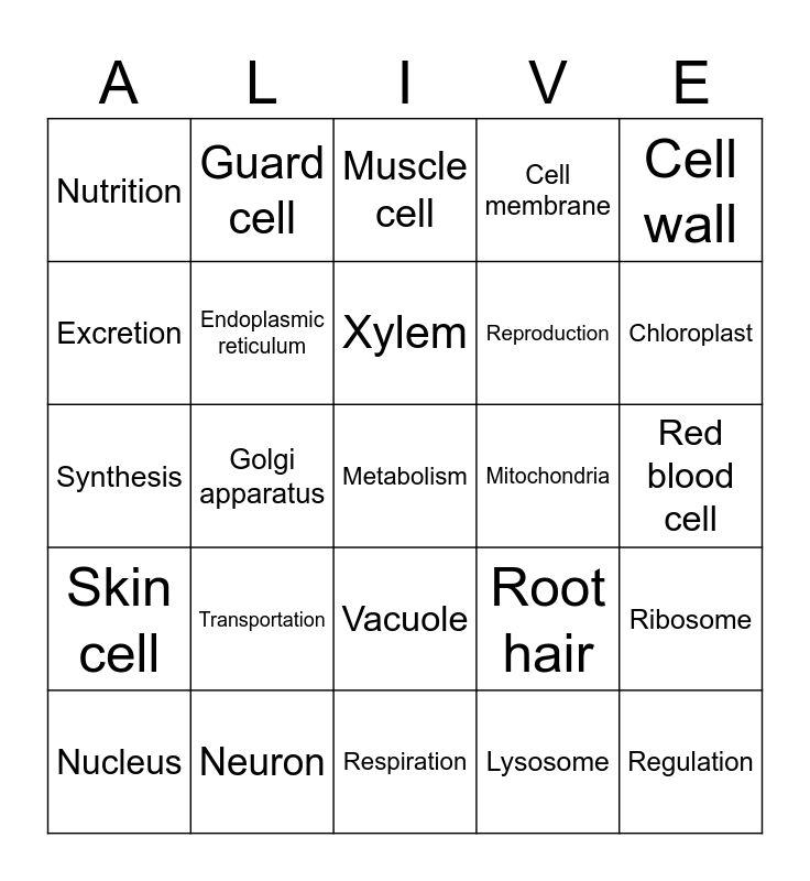 This bingo card has 25 words: Transportation, Respiration, Xylem, Nucleus, Cell wall, Nutrition, Excretion, Guard cell, Mitochondria, Vacuole, Reproduction, Synthesis, Root hair, Ribosome, Endoplasmic reticulum, Regulation, Red blood cell, Muscle cell, Chloroplast, Golgi apparatus, Metabolism, Neuron, Skin cell, Cell membrane and Lysosome.