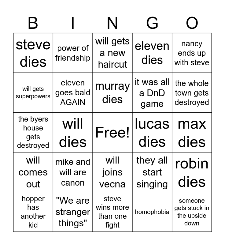 This bingo card has a free space and 24 words: mike and will are canon, "We are stranger things", murray dies, hopper has another kid, nancy ends up with steve, steve dies, will gets superpowers, power of friendship, lucas dies, will joins vecna, it was all a DnD game, the byers house gets destroyed, they all start singing, robin dies, eleven goes bald AGAIN, homophobia, max dies, will gets a new haircut, the whole town gets destroyed, will dies, someone gets stuck in the upside down, will comes out, eleven dies and steve wins more than one fight.