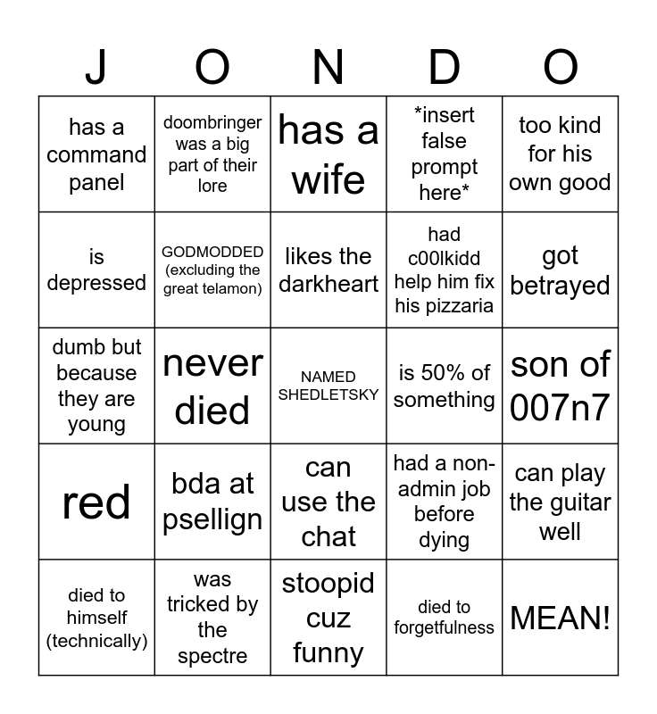 This bingo card has a free space and 34 words: DEMON CHILD, died to forgetfulness, depressed, death is unknown to everyone, red, GODMODDED (excluding the great telamon), too kind for his own good, died to himself (technically), doombringer was a big part of their lore, C00L, likes the darkheart, has a wife, likes the illumina, died to an in game killer to be brought to the realm, is 50% of something, got betrayed, was tricked by the spectre, dumb but because they are young, bda at psellign, had a non-admin job before dying, can use the chat, knows the full two time backstory, has a command panel, son of 007n7, stoopid cuz funny, MEAN!, *insert false prompt here*, was an ex-admin turned evil, had c00lkidd help him fix his pizzaria, is depressed, DEGENERATE GAMBLER, never died, can play the guitar well and HAS FRICKIN GODHACKS.
