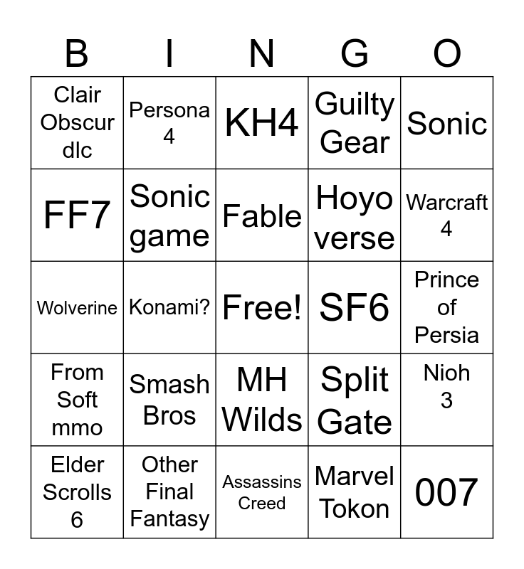 This bingo card has a free space and 24 words: Smash Bros, Other Final Fantasy, Fable, Elder Scrolls 6, Sonic, Clair Obscur dlc, FF7, Persona 4, SF6, MH Wilds, Hoyo verse, Wolverine, Split Gate, Nioh 3, Sonic game, Marvel Tokon, Prince of Persia, KH4, Warcraft 4, Konami?, 007, From Soft mmo, Guilty Gear and Assassins Creed.