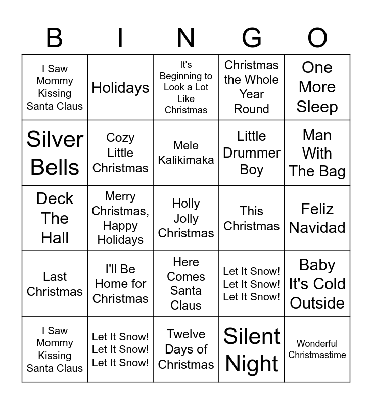 ⚠ This card has duplicate items: All I Want for Christmas Is You (2), Baby It's Cold Outside (2), Blue Christmas (2), Christmas (Baby Please Come Home) (2), The Christmas Song (2), Christmas the Whole Year Round (2), Christmas Tree Farm (2), Christmas Without You (2), Cozy Little Christmas (2), Deck The Hall (2), Do You Hear What I Hear? (2), Feliz Navidad (2), Frosty the Snowman (2), Hallelujah (2), Have Yourself a Merry Little Christmas (2), Here Comes Santa Claus (2), Holidays (2), Holly Jolly Christmas (2), I'll Be Home for Christmas (2), I Saw Mommy Kissing Santa Claus (2), It's Beginning to Look a Lot Like Christmas (2), It's the Most Wonderful Time of the Year (2), Jingle Bell Rock (2), Joy To The World (2), Last Christmas (2), Let It Snow! Let It Snow! Let It Snow! (2), Like It's Christmas (2), Little Drummer Boy (2), Little Saint Nick (2), Man With The Bag (2), Mele Kalikimaka (2), Merry Christmas, Happy Holidays (2), Mistletoe (2), My Only Wish (This Year) (2), Officially Christmas (2), Oh Santa! (2), One More Sleep (2), Please Come Home For Christmas (2), Rockin' Around The Christmas Tree (2), Rudolph the Red-Nosed Reindeer (2), Run Rudolph Run (2), Santa Baby (2), Santa Claus Is Coming to Town (2), Santa's Coming for Us (2), Santa Tell Me (2), Silent Night (2), Silver Bells (2), Sleigh Ride (2), Snowman (2), That's Christmas to Me (2), This Christmas (2), Twelve Days of Christmas (2), Underneath the Tree (2), White Christmas (2), Winter Wonderland (2), Wonderful Christmastime (2), You Make It Feel Like Christmas (2), You're A Mean One Mr. Grinch (2)