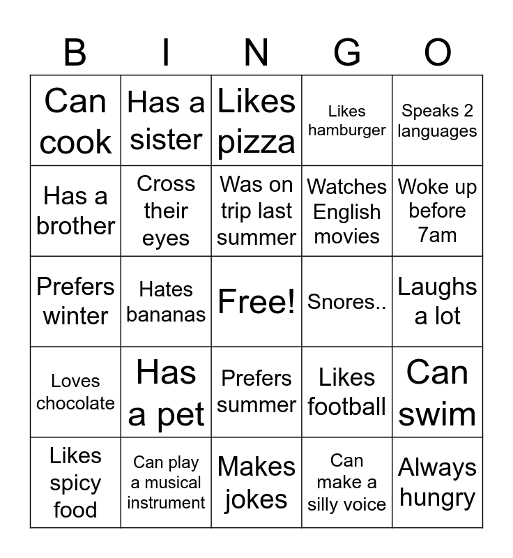 This bingo card has a free space and 24 words: Has a pet, Can play a musical instrument, Was on trip last summer, Likes spicy food, Speaks 2 languages, Can cook, Has a brother, Has a sister, Snores.., Prefers summer, Watches English movies, Prefers winter, Likes football, Can swim, Cross their eyes, Can make a silly voice, Laughs a lot, Likes pizza, Woke up before 7am, Hates bananas, Always hungry, Loves chocolate, Likes hamburger and Makes jokes.