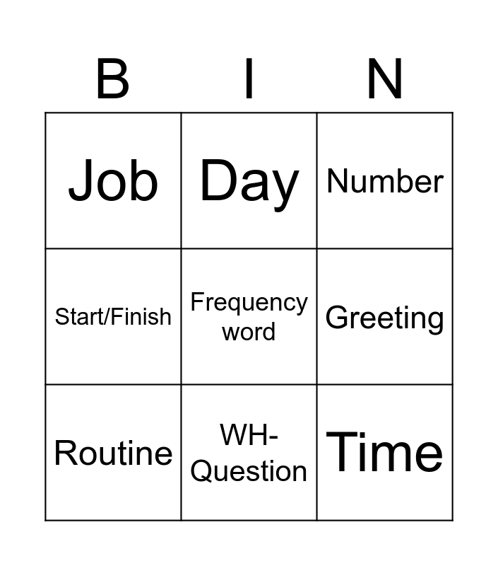 This bingo card has a free space and 8 words: Greeting, Number, Day, Routine, Job, Time, Start/Finish and WH-Question.