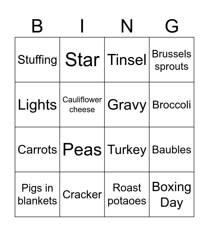 This bingo card has 16 words: Cracker, Baubles, Tinsel, Stuffing, Carrots, Star, Turkey, Roast potaoes, Lights, Cauliflower cheese, Pigs in blankets, Brussels sprouts, Peas, Broccoli, Gravy and Boxing Day.