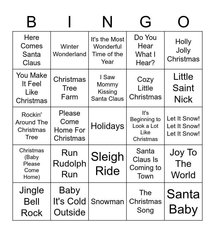 This bingo card has 58 words: All I Want for Christmas Is You, Baby It's Cold Outside, Blue Christmas, Christmas (Baby Please Come Home), The Christmas Song, Christmas the Whole Year Round, Christmas Tree Farm, Christmas Without You, Cozy Little Christmas, Deck The Hall, Do You Hear What I Hear?, Feliz Navidad, Frosty the Snowman, Hallelujah, Have Yourself a Merry Little Christmas, Here Comes Santa Claus, Holidays, Holly Jolly Christmas, I'll Be Home for Christmas, I Saw Mommy Kissing Santa Claus, It's Beginning to Look a Lot Like Christmas, It's the Most Wonderful Time of the Year, Jingle Bell Rock, Joy To The World, Last Christmas, Let It Snow! Let It Snow! Let It Snow!, Like It's Christmas, Little Drummer Boy, Little Saint Nick, Man With The Bag, Mele Kalikimaka, Merry Christmas, Happy Holidays, Mistletoe, My Only Wish (This Year), Officially Christmas, Oh Santa!, One More Sleep, Please Come Home For Christmas, Rockin' Around The Christmas Tree, Rudolph the Red-Nosed Reindeer, Run Rudolph Run, Santa Baby, Santa Claus Is Coming to Town, Santa's Coming for Us, Santa Tell Me, Silent Night, Silver Bells, Sleigh Ride, Snowman, That's Christmas to Me, This Christmas, Twelve Days of Christmas, Underneath the Tree, White Christmas, Winter Wonderland, Wonderful Christmastime, You Make It Feel Like Christmas and You're A Mean One Mr. Grinch.