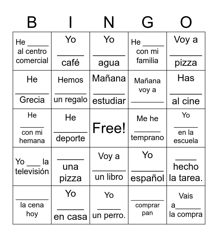 This bingo card has a free space and 24 words: _____ una pizza, Yo _____ en casa, Mañana ______ estudiar, ________ la cena hoy, Voy a ______ pizza, He _____ al centro comercial, He _______ Grecia, Yo _____ café, Me he ______ temprano, Voy a _______ un libro, Mañana voy a ________, He ______ con mi hemana, Yo ______ español, ____ hecho la tarea., Hemos _______ un regalo, _________ comprar pan, Yo ______ en la escuela, Yo ______ agua, Has ______ al cine, He _______ deporte, Vais a______ la compra, Yo ___ la televisión, He _____ con mi familia and Yo _____ un perro..