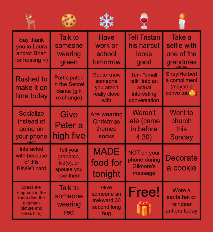 This bingo card has 30 words: Talk to someone wearing red, Clean up after yourself, Give Peter a high five, Brought in food for tonight, Say thank you to Laura and/or Brian for hosting =), Have work or school tomorrow, Participated in the Secret Santa (gift exchange), MADE food for tonight, Weren't late (came in before 4:30), Give someone an awkward 30 second long hug, Went to church this Sunday, Are wearing Christmas themed socks, Free! π, Wore a santa hat or reindeer antlers today, Give Shay/Herbert a compliment (maybe a convo tooπ), Keep your eyes closed during the prayer, NOT on your phone during Gilmore's message, Got interacted with because of this BINGO card, Tell your grandma, kid(s), or spouse you love them, Take a selfie with one of the grandmas, Socialize instead of going on your phone, Gave your pet(s) a Christmas gift, Talk to someone wearing green, Turn "small talk" into an actual interesting conversation, Rushed to make it on time today, Tell Tristan his haircut looks good, Decorate a cookie, Dress the elephant in the room (find the elephant picture and dress him), Get to know someone you aren't really close with and Pet Pluto.
