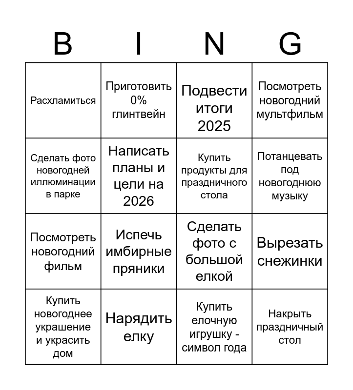 This bingo card has 16 words: Нарядить елку, Вырезать снежинки, Подвести итоги 2025, Расхламиться, Посмотреть новогодний фильм, Приготовить 0% глинтвейн, Сделать фото с большой елкой, Купить елочную игрушку - символ года, Сделать фото новогодней иллюминации в парке, Написать планы и цели на 2026, Купить новогоднее украшение и украсить дом, Посмотреть новогодний мультфильм, Испечь имбирные пряники, Потанцевать под новогоднюю музыку, Купить продукты для праздничного стола and Накрыть праздничный стол.