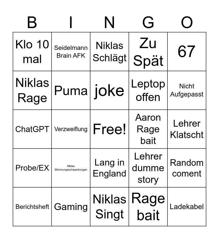 This bingo card has a free space and 24 words: Niklas Stimmungsschwankungen, Gaming, joke, Berichtsheft, 67, Klo 10 mal, Niklas Rage, Seidelmann Brain AFK, Aaron Rage bait, Lang in England, Leptop offen, ChatGPT, Lehrer dumme story, Random coment, Puma, Rage bait, Lehrer Klatscht, Niklas Schlägt, Nicht Aufgepasst, Verzweiflung, Ladekabel, Probe/EX, Zu Spät and Niklas Singt.