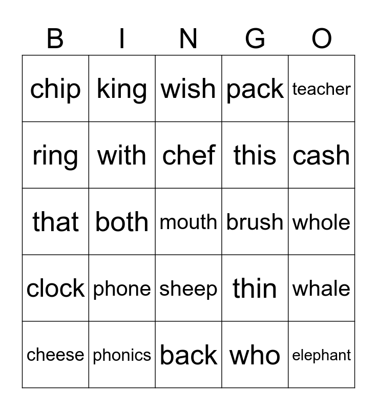 This bingo card has a free space and 24 words: phone, phonics, chef, cheese, teacher, chip, ring, king, brush, sheep, this, that, thin, whale, with, who, whole, wish, cash, both, elephant, clock, pack and back.