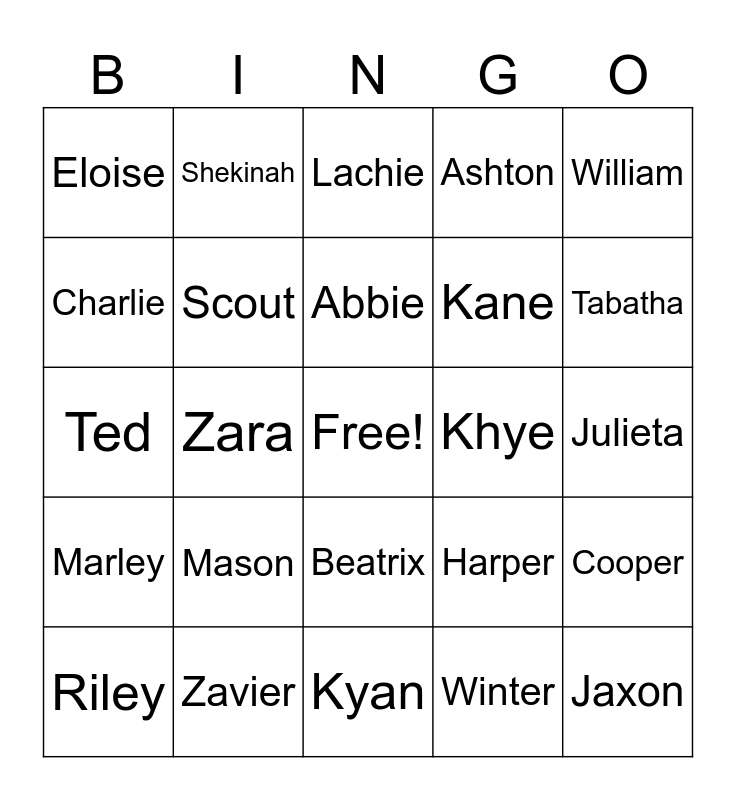 This bingo card has a free space and 27 words: Harper, Alex, Kane, Kyan, Charlie, Lachie, Shekinah, Marley, Khye, Cooper, Ted, Ashton, Riley, Zavier, Tabatha, Lara, Scout, Abbie, Mason, Eloise, Julieta, Winter, Zara, Jaxon, Beatrix, William and Ava.