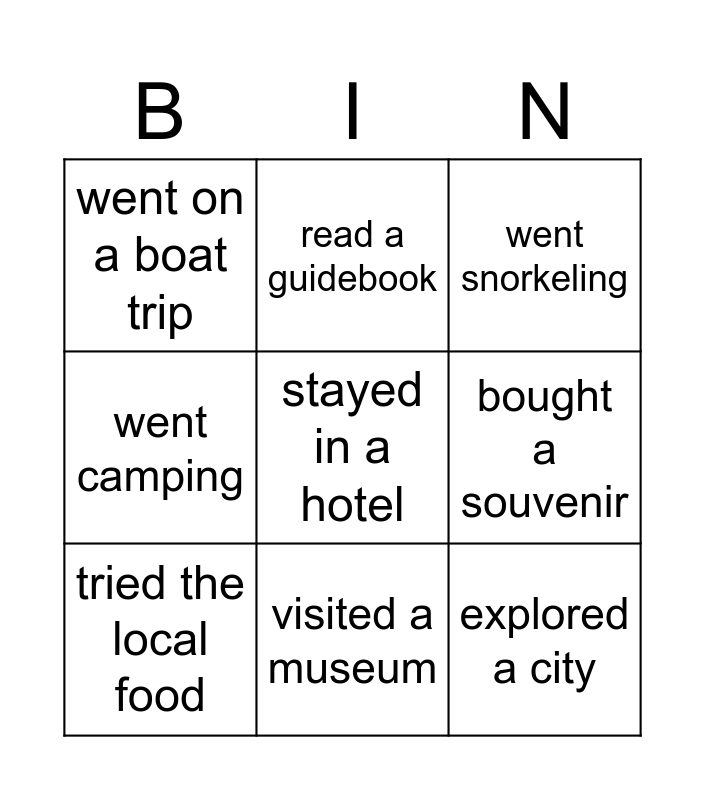 This bingo card has a free space and 8 words: bought a souvenir, went snorkeling, read a guidebook, tried the local food, went on a boat trip, explored a city, went camping and visited a museum.