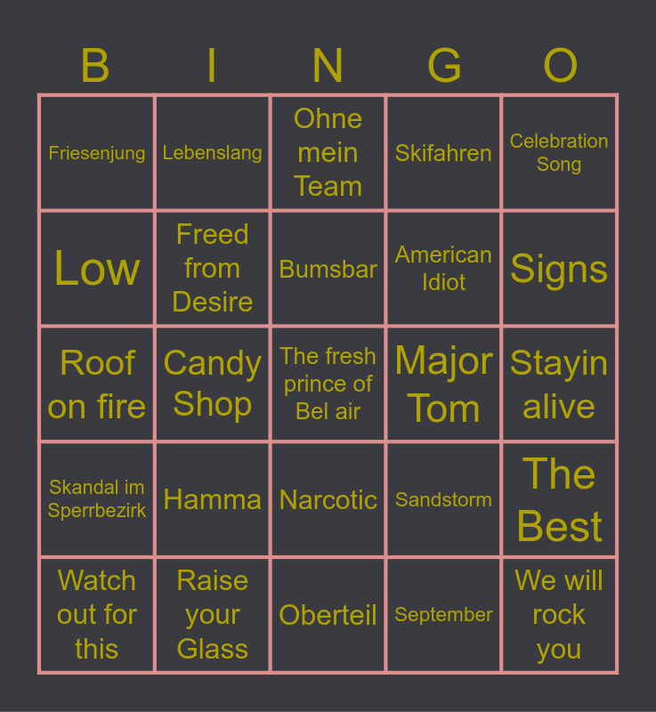 This bingo card has 25 words: Hamma, Oberteil, Bumsbar, Watch out for this, Celebration Song, Friesenjung, Low, Lebenslang, Major Tom, Narcotic, American Idiot, Roof on fire, Sandstorm, The Best, Freed from Desire, We will rock you, Stayin alive, Ohne mein Team, Signs, Candy Shop, The fresh prince of Bel air, Raise your Glass, Skandal im Sperrbezirk, Skifahren and September.