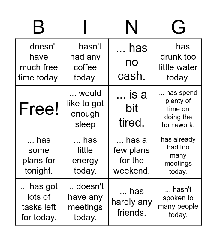 This bingo card has 16 words: ... doesn't have any meetings today., has already had too many meetings today., ... has no cash., ... doesn't have much free time today., ... has some plans for tonight., ... hasn't had any coffee today., ... has a few plans for the weekend., ... has hardly any friends., Free!, ... would like to got enough sleep, ... has got lots of tasks left for today., ... has drunk too little water today., ... has little energy today., ... has spend plenty of time on doing the homework., ... is a bit tired. and ... hasn't spoken to many people today..