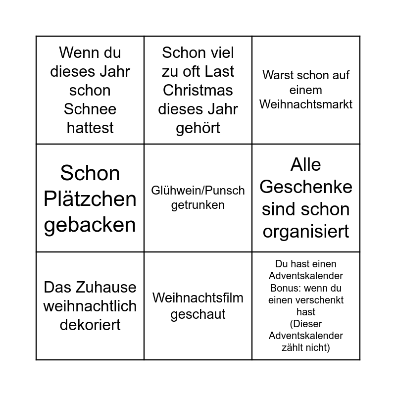 This bingo card has 9 words: Das Zuhause weihnachtlich dekoriert, Warst schon auf einem Weihnachtsmarkt, Schon viel zu oft Last Christmas dieses Jahr gehört, Schon Plätzchen gebacken, Wenn du dieses Jahr schon Schnee hattest, Alle Geschenke sind schon organisiert, Glühwein/Punsch getrunken, Du hast einen Adventskalender Bonus: wenn du einen verschenkt hast (Dieser Adventskalender zählt nicht) and Weihnachtsfilm geschaut.