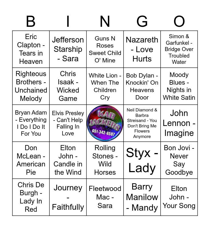 This bingo card has a free space and 64 words: Reo Speedwagon - Take It On The Run, Warrant - Heaven, Bonnie Tyler - It's A Heartache, Bon Jovi - Never Say Goodbye, Queensryche - Silent Lucidity, Poison - I Won't Forget You, Jefferson Starship - Sara, Scorpions - Send Me An Angel, White Lion - When The Children Cry, Def Leppard - Love Bites, Rolling Stones - Wild Horses, Air Supply - Lost In Love, John Lennon - Imagine, Simon & Garfunkel - Bridge Over Troubled Water, Beatles - Let It Be, Righteous Brothers - Unchained Melody, Elvis Presley - Can't Help Falling In Love, Eric Clapton -Tears in Heaven, Billy Joel -Piano Man, Bob Dylan - Knockin' On Heavens Door, Elton John - Candle in the Wind, Don McLean - American Pie, Nazareth - Love Hurts, Eagles - Desperado, Journey - Open Arms, Kansas - Dust In The Wind, Aerosmith - I Don't Want to Miss a Thing, Guns N Roses - November Rain, Allman Brothers - Melissa, Lynyrd Skynyrd - Free Bird, REO Speedwagon - Can't Fight This Feeling, Peter Frampton - Baby I Love Your Way, Eric Clapton - Wonderful Tonight, Simon & Garfunkel - The Sound of Silence, Moody Blues - Nights in White Satin, Chris De Burgh - Lady In Red, Berlin - Take My Breath Away, Barry Manilow - Mandy, Foreigner - I Want To Know What Love Is, Chris Isaak - Wicked Game, Bryan Adam - Everything I Do I Do It For You, Neil Diamond & Barbra Streisand - You Don't Bring Me Flowers Anymore, Bob Seger - We've Got Tonight, Guns N Roses - Patience -, REO Speedwagon - Keep On Loving You -, Elton John - Your Song, Journey - Faithfully, Eric Carmen - All By Myself, Styx - Lady, Neil Diamond - Hello Again, The Doors - The Crystal Ship, Firehouse - Love Of A Lifetime, Fleetwood Mac - Sara, Phil Collins - Against All Odds, Poison - Every Rose Has Its Thorn, Pink Floyd - Hey You, Guns N Roses Sweet Child O' Mine, Bon Jovi - Bed Of Roses, Night Ranger Sister Christian, Bob Seger - Turn The Page, KISS - Beth, Billy Joel - She's Always A Woman To Me, Bob Dylan - It's All Over Now, Baby Blue and Hall & Oats - She's Gone.