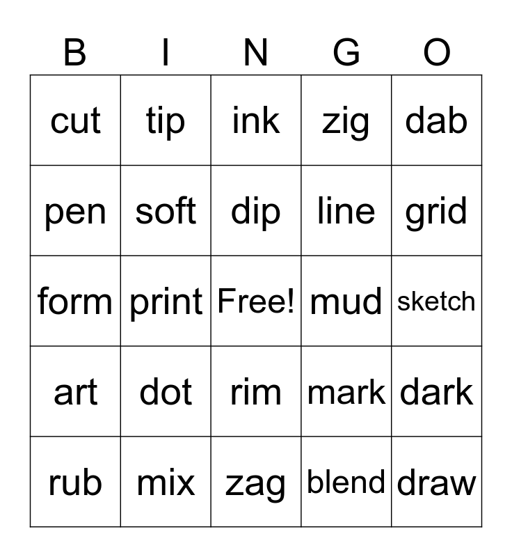 This bingo card has a free space and 24 words: dot, mix, dip, rub, dab, cut, pen, tip, mud, rim, line, form, mark, dark, soft, blend, sketch, ink, grid, print, draw, art, zig and zag.