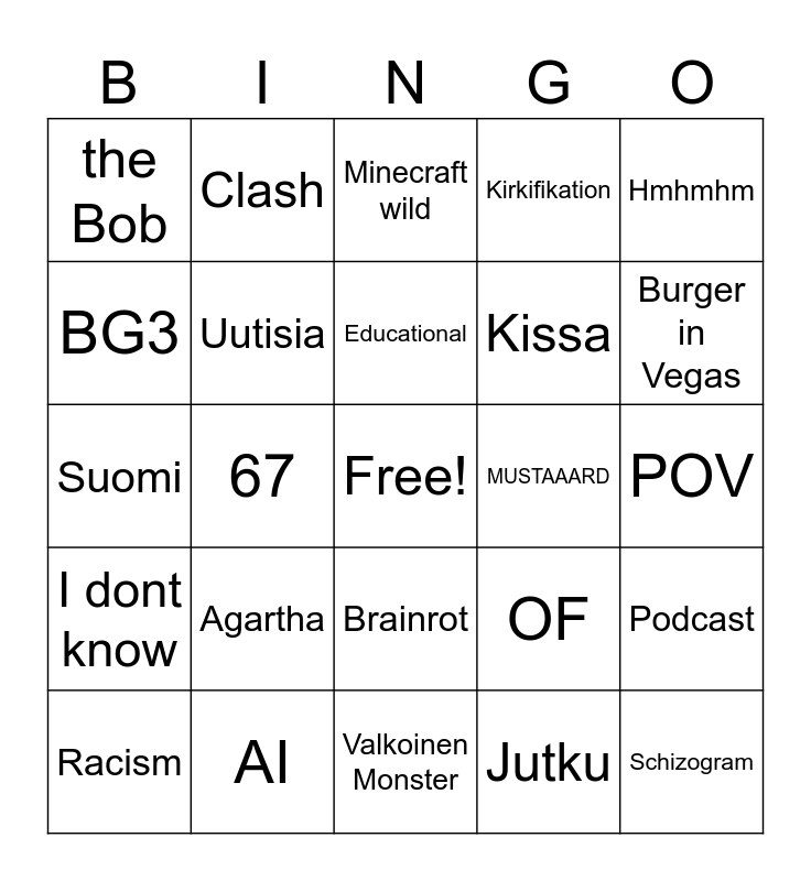 This bingo card has a free space and 24 words: Agartha, AI, Educational, Racism, Hmhmhm, the Bob, BG3, Clash, MUSTAAARD, Brainrot, Kissa, Suomi, OF, Podcast, Uutisia, Jutku, POV, Minecraft wild, Burger in Vegas, 67, Schizogram, I dont know, Kirkifikation and Valkoinen Monster.