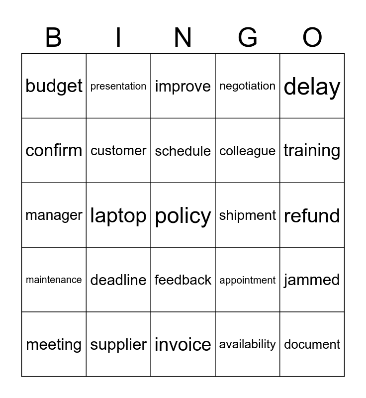 This bingo card has 25 words: deadline, invoice, schedule, meeting, delay, budget, confirm, presentation, shipment, feedback, colleague, manager, appointment, jammed, customer, document, refund, improve, training, laptop, policy, supplier, maintenance, negotiation and availability.