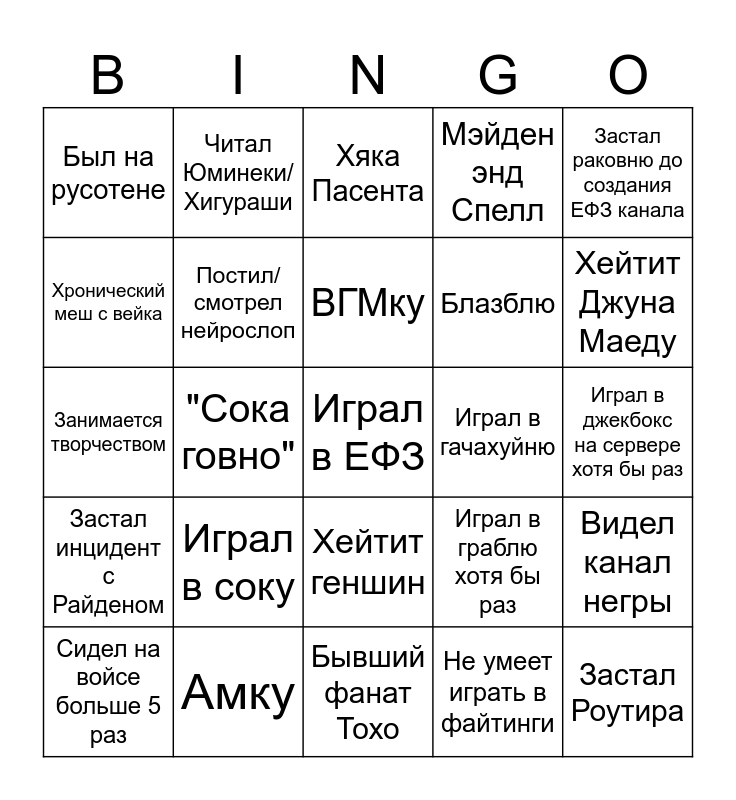 This bingo card has a free space and 24 words: Играл в соку, Амку, ВГМку, Сидел на войсе больше 5 раз, Застал раковню до создания ЕФЗ канала, Был на русотене, Хронический меш с вейка, Читал Юминеки/Хигураши, Играл в гачахуйню, Хейтит геншин, Блазблю, Занимается творчеством, Играл в граблю хотя бы раз, Видел канал негры, Постил/смотрел нейрослоп, Не умеет играть в файтинги, Играл в джекбокс на сервере хотя бы раз, Хяка Пасента, Хейтит Джуна Маеду, "Сока говно", Застал Роутира, Застал инцидент с Райденом, Мэйден энд Спелл and Бывший фанат Тохо.
