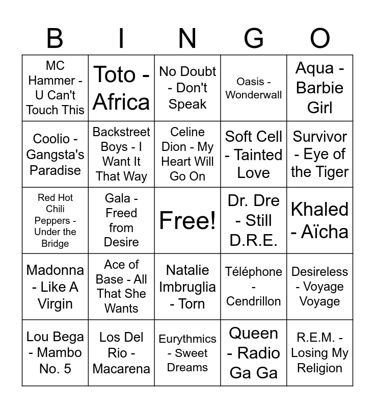 This bingo card has a free space and 59 words: Daft Punk - Around the World, Los Del Rio - Macarena, Michael Jackson - Billie Jean, Madonna - Like A Virgin, Queen - Radio Ga Ga, a-ha - Take On Me, Backstreet Boys - I Want It That Way, IAM - Je danse le Mia, Soft Cell - Tainted Love, Spice Girls - Wannabe, Oasis - Wonderwall, Shania Twain - Man! I Feel Like a Woman!, Coolio - Gangsta's Paradise, Blur - Song 2, Corona - The Rhythm of the Night, MC Hammer - U Can't Touch This, R.E.M. - Losing My Religion, Aqua - Barbie Girl, Ricky Martin - Livin' la Vida Loca, Celine Dion - My Heart Will Go On, Dr. Dre - Still D.R.E., No Doubt - Don't Speak, Lou Bega - Mambo No. 5, Desireless - Voyage Voyage, Partenaire Particulier - Partenaire Particulier, Ray Parker Jr. - Ghostbusters, Nirvana - Smells Like Teen Spirit, Britney Spears - ...Baby One More Time, Survivor - Eye of the Tiger, Europe - The Final Countdown, Depeche Mode - Just Can't Get Enough, George Michael - Careless Whisper, Rick Astley - Never Gonna Give You Up, The Police - Every Breath You Take, Toto - Africa, Indochine - L'Aventurier, Images Demons - Les Démons de Minuit, Gala - Freed from Desire, Haddaway - What Is Love, Red Hot Chili Peppers - Under the Bridge, The Cranberries - Zombie, Ace of Base - All That She Wants, Khaled - Aïcha, Manau - La Tribu de Dana, Whitney Houston - I Wanna Dance with Somebody, Bonnie Tyler - Total Eclipse of the Heart, Zebda - Tomber la chemise, Eiffel 65 - Blue (Da Ba Dee), Natalie Imbruglia - Torn, Eurythmics - Sweet Dreams, Cyndi Lauper - Girls Just Want to Have Fun, Bon Jovi - Livin' on a Prayer, Prince - Purple Rain Wham! - Wake Me Up Before You Go-Go, Scorpions - Still Loving You, Kim Wilde - Kids in America, Téléphone - Cendrillon, Jean-Jacques Goldman - Quand la musique est bonne, Guns N' Roses - Sweet Child o' Mine and Stevie Wonder - I Just Called to Say I Love You.