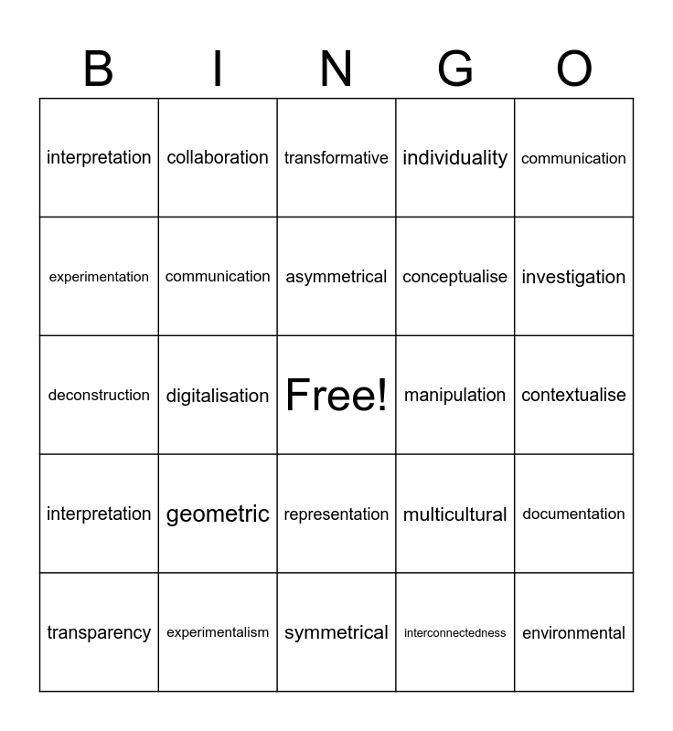 This bingo card has a free space and 25 words: geometric, symmetrical, asymmetrical, transparency, communication, interpretation, experimentation, collaboration, manipulation, representation, conceptualise, deconstruction, multicultural, documentation, communication, illumination, contextualise, transformative, investigation, digitalisation, environmental, experimentalism, interpretation, individuality and interconnectedness.