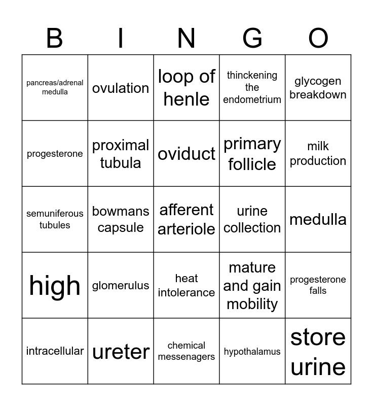 This bingo card has 29 words: intracellular, between cells, bowmans capsule, store urine, pancreas/adrenal medulla, loop of henle, proximal tubula, glomerulus, urine collection, ureter, medulla, afferent arteriole, chemical messenagers, hypothalamus, milk production, thyroid gland, heat intolerance, high, glycogen breakdown, semuniferous tubules, mature and gain mobility, ovary, primary follicle, progesterone, thinckening the endometrium, ovulation, progesterone falls, oviduct and uterus.