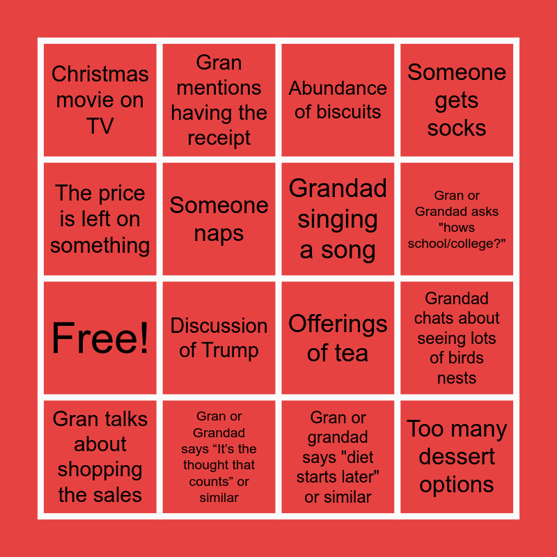 This bingo card has 20 words: Grandad chats about seeing lots of birds nests, Grandad: “The weather- man said...” or similar, Abundance of biscuits, Someone refuses to wear their cracker hat, Gran talks about shopping the sales, The price is left on something, Gran or Grandad says “It’s the thought that counts” or similar, Christmas movie on TV, Free!, Gran mentions having the receipt, Discussion of Trump, Offerings of tea, Someone naps, Too many dessert options, Grandad singing a song, Gran or grandad calls someone the wrong name, Gran or Grandad asks "hows school/college?", Someone gets socks, Gran or grandad says "diet starts later" or similar and grandparent says "there's more food in the kitchen" or similar.