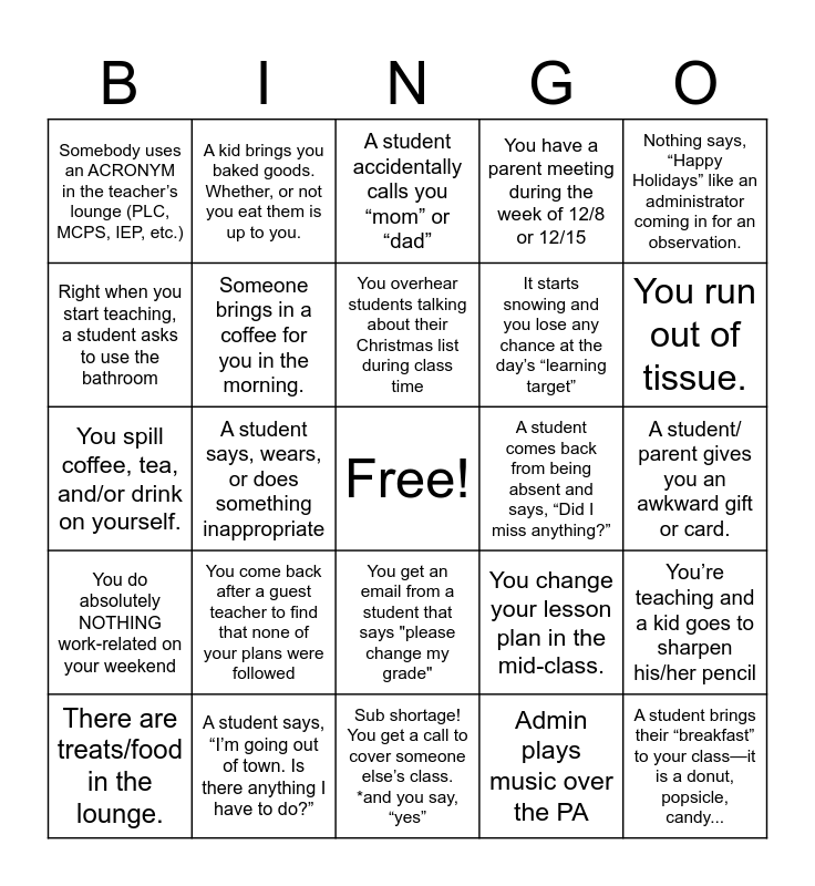 This bingo card has a free space and 24 words: You come back after a guest teacher to find that none of your plans were followed, A student says, “I’m going out of town. Is there anything I have to do?”, You overhear students talking about their Christmas list during class time, There are treats/food in the lounge., Nothing says, “Happy Holidays” like an administrator coming in for an observation., Somebody uses an ACRONYM in the teacher’s lounge (PLC, MCPS, IEP, etc.), Right when you start teaching, a student asks to use the bathroom, A kid brings you baked goods. Whether, or not you eat them is up to you., A student comes back from being absent and says, “Did I miss anything?”, You get an email from a student that says "please change my grade", It starts snowing and you lose any chance at the day’s “learning target”, You spill coffee, tea, and/or drink on yourself., You change your lesson plan in the mid-class., You’re teaching and a kid goes to sharpen his/her pencil, Someone brings in a coffee for you in the morning., Admin plays music over the PA, A student/ parent gives you an awkward gift or card., A student accidentally calls you “mom” or “dad”, You run out of tissue., A student says, wears, or does something inappropriate, A student brings their “breakfast” to your class—it is a donut, popsicle, candy..., You do absolutely NOTHING work-related on your weekend, You have a parent meeting during the week of 12/8 or 12/15 and Sub shortage! You get a call to cover someone else’s class. *and you say, “yes”.