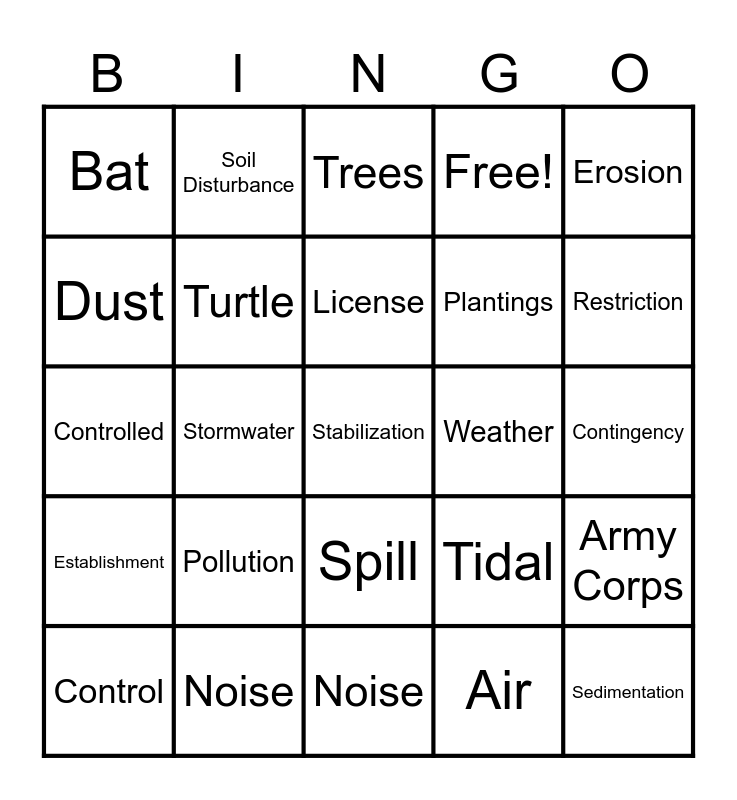 This bingo card has 81 words: Cultural, Sedimentation Control System, Trees, Stormwater, Regulatory, Soil Disturbance, Violation, Invasive, Permit, Tidal, Army Corps, Compliance, Free!, Bat, Water-handling, Dust, Compliance, Pollution, Dewatering, Contingency, Spill, Erosion, Controlled, License, Turtle, Authorization, Fish, DEEP, Coordination, Flood, Restriction, Establishment, Noise, Sedimentation, Control, Weather, Turbidity, Air, Disposal, Plantings, Stabilization, Cultural, Sedimentation Control System, Trees, Stormwater, Regulatory, Soil Disturbance, Violation, Invasive, Permit, Tidal, Army Corps, Compliance, Bat, Water-handling, Dust, Compliance, Pollution, Dewatering, Contingency, Spill, Erosion, Controlled, License, Turtle, Authorization, Fish, DEEP, Coordination, Flood, Restriction, Establishment, Noise, Sedimentation, Control, Weather, Turbidity, Air, Disposal, Plantings and Stabilization.