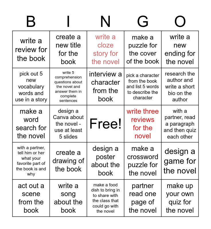 This bingo card has a free space and 24 words: create a drawing of the book, write a song about the book, interview a character from the book, act out a scene from the book, write a new ending for the novel, write a review for the book, pick out 5 new vocabulary words and use in a story, create a new title for the book, write three reviews for the novel, design a poster about the book, pick a character from the book and list 5 words to describe the character, make a word search for the novel, make a crossword puzzle for the novel, design a game for the novel, write 5 comprehension questions about the novel and answer them in complete sentences, partner read one page of the novel, with a partner, read a paragraph and then quiz each other, write a cloze story for the novel, research the author and write a short bio on the author, design a Canva about the novel - use at least 5 slides, make up your own quiz for the novel, with a partner, tell him or her what your favorite part of the book is and why, make a puzzle for the cover of the book and make a food dish to bring in to share with the class that could go with the novel.