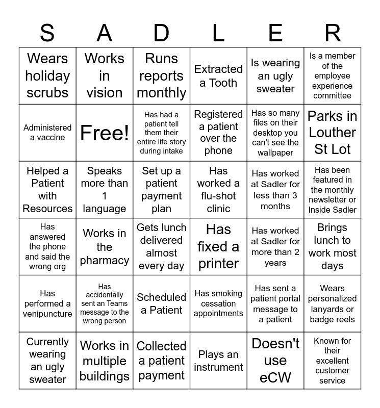 This bingo card has 46 words: Currently Wearing a Sadler Shirt, Helped a Patient with Resources, Checked in a Patient, Has worked at Sadler for more than 2 years, Has worked at Sadler for less than 3 months, Has smoking cessation appointments, Works in vision, Has a drawer full of snacks, Is a member of the employee experience committee, Works in multiple buildings, Administered a vaccine, Extracted a Tooth, Works in the pharmacy, Has answered the phone and said the wrong org, Doesn't use eCW, Scheduled a Patient, Free!, Speaks more than 1 language, Winner of a Pillars of Care Award, Is wearing an ugly sweater, Parks in Louther St Lot, Brings lunch to work most days, Wears holiday scrubs, Has had a patient tell them their entire life story during intake, Helps patients with getting insurance, Registered a patient over the phone, Gets lunch delivered almost every day, Always has an iced coffee, Has been featured in the monthly newsletter or Inside Sadler, Has worked a flu-shot clinic, Has a work water bottle that’s basically their identity, Has accidentally sent an Teams message to the wrong person, Plays an instrument, Known for their excellent customer service, Collected a patient payment, Has fixed a printer, Set up a patient payment plan, Currently wearing an ugly sweater, Has access to payer websites, Has sent a patient portal message to a patient, Has performed a venipuncture, Runs reports monthly, Has so many files on their desktop you can't see the wallpaper, Has arrived at work before 7 AM, Wears personalized lanyards or badge reels and Has forgotten their work badge.
