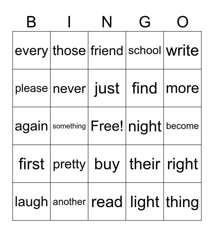 This bingo card has a free space and 24 words: pretty, another, just, laugh, write, every, please, those, night, buy, find, again, their, right, never, light, become, friend, more, something, thing, first, school and read.
